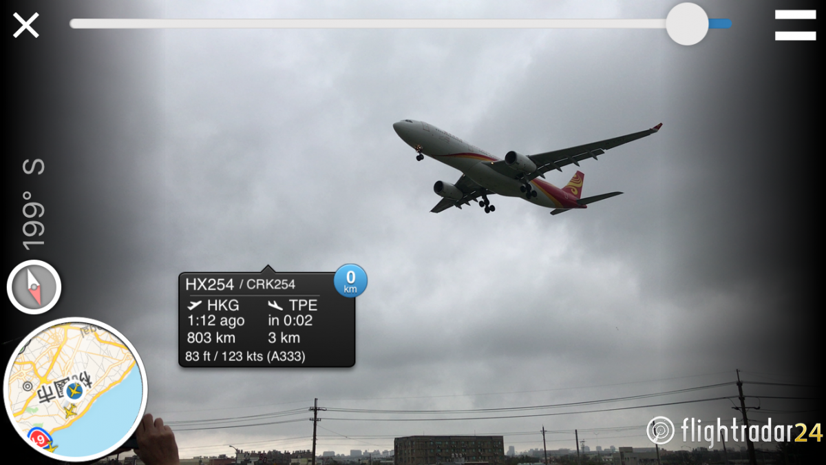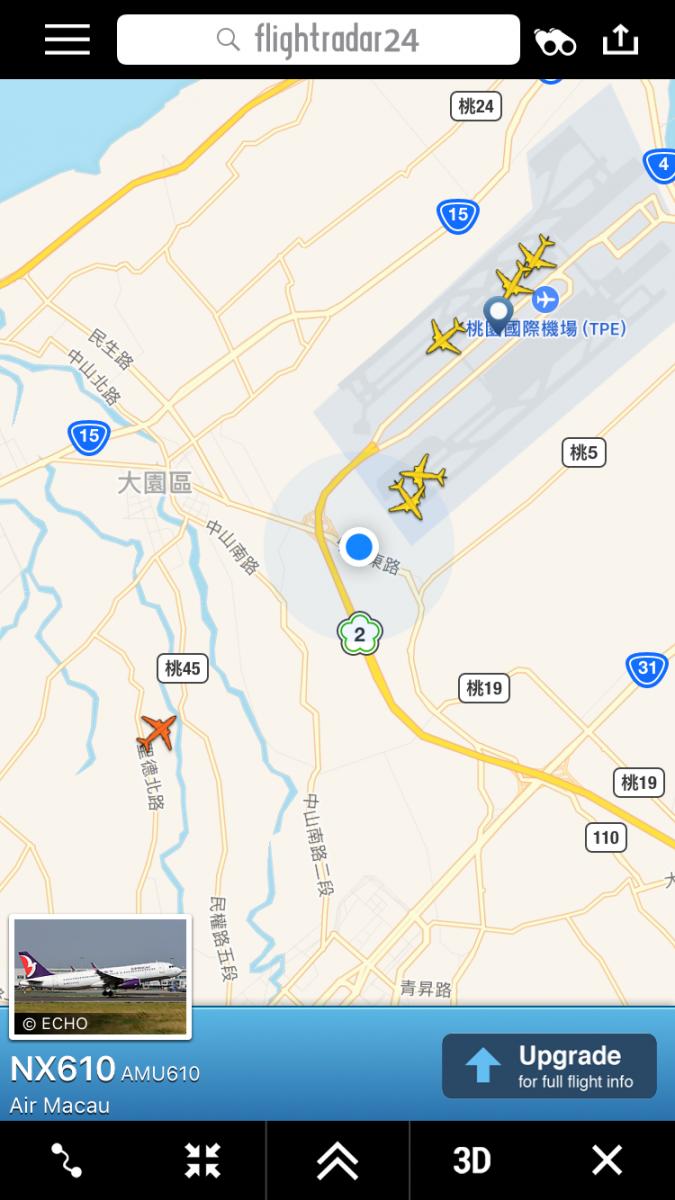 所以我用了 Fightradar24這個app,這個app會即時顯示所有民航機的位置跟資訊(包含班機編號、航向速度、目的地等都有)
