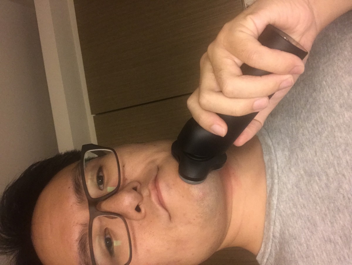 首先,這東西你要按得有點用力才會有效果,才會有刮到鬍子的感覺第二,其實刮起來刺刺的不是很舒服,感覺會有被那個網子刺到的感覺第三,也就是最重要的要刮乾淨的話要很久。你需要把刮鬍刀貼緊,然後來回刮