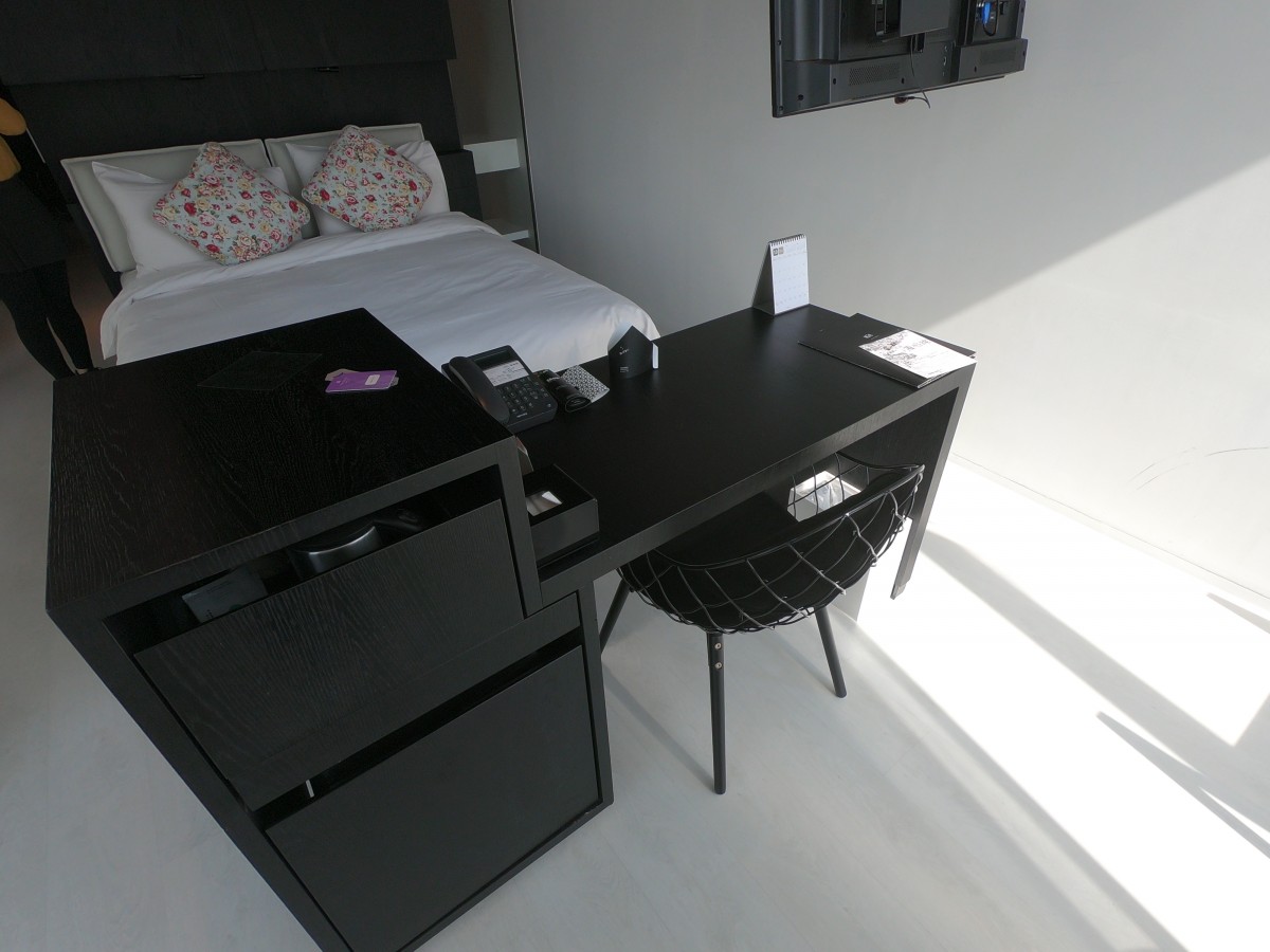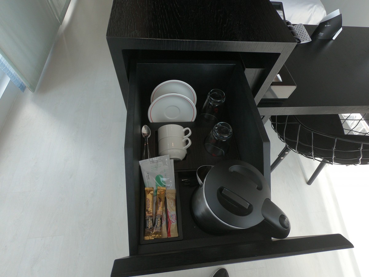 書桌也很簡單,把茶壺跟用具都藏在櫃子裡了